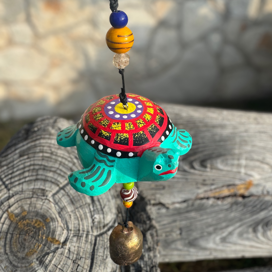 Each chime is handmade, from the turtle to the beads to even the bell! Slight variations may occur.